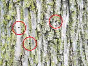 Swingle Lawn, Tree and Landscape Care- Emerald ash borer adult beetles leave a D shaped exit hold in the bark